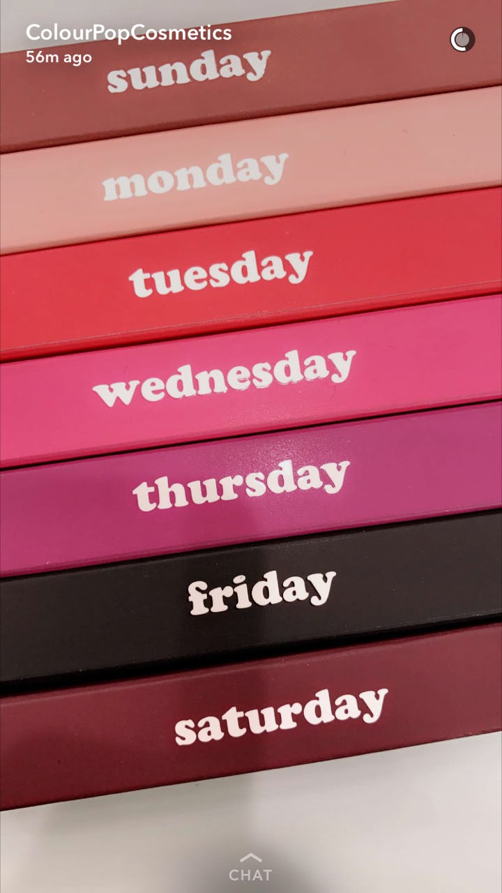 Looking for a way to spruce up your week? Well, ColourPop has you covered. They came up with a brand new Ultra Matte Lip set that has a color to correspond with all the days of the week. Sort of like those underwear with the days on them, but way more trendy. There's everything from rosy nudes and bright pinks to vampy purples and even a black. Basically, it has a color for every occasion.