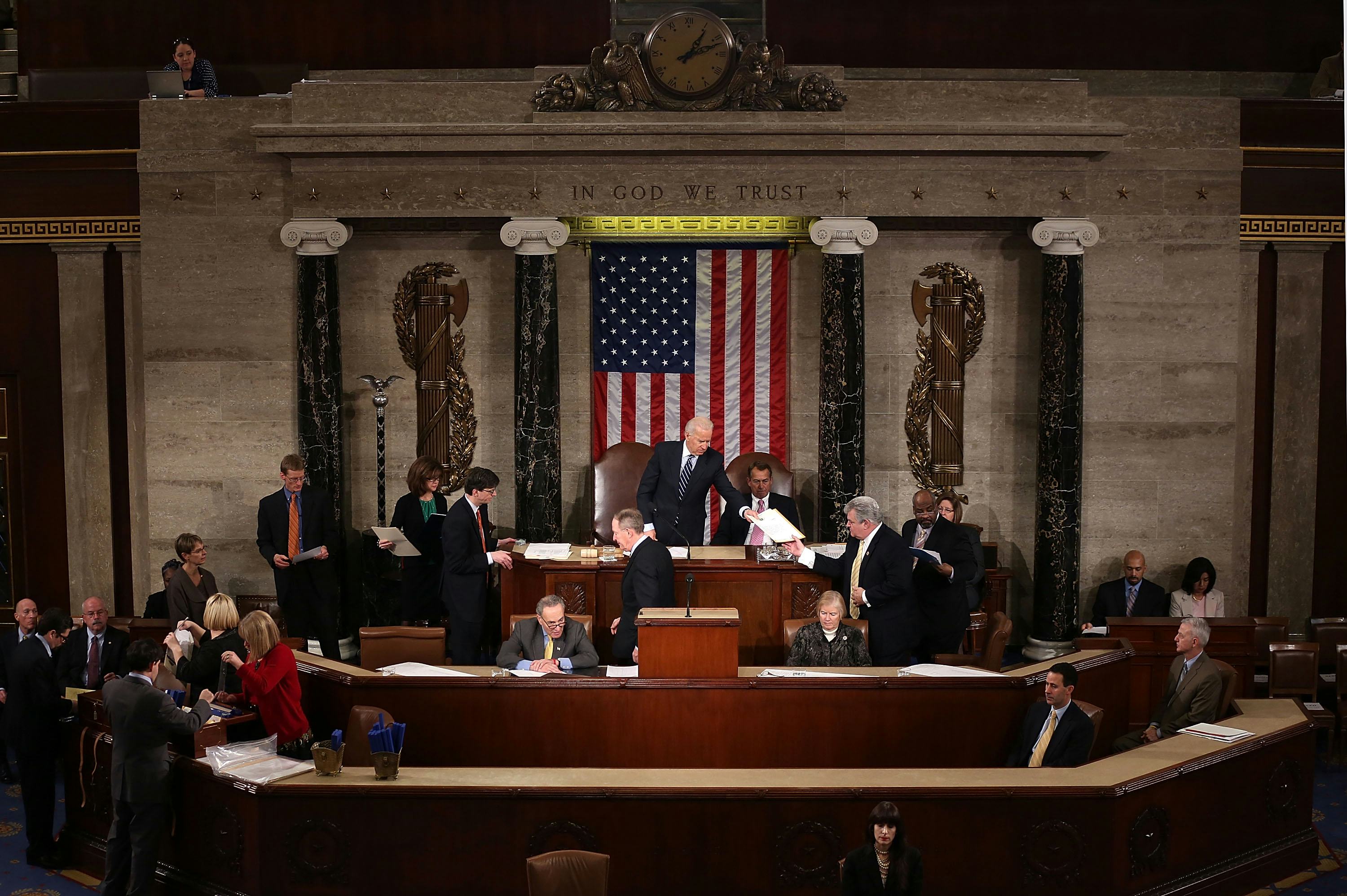 At the joint session, the president of the Senate first opens and presents the certificates of vote in alphabetical order. Next, four tellers, who are members of Congress and Senators who were pre-selected for this process, read each one of the certificates of vote; afterward, the tellers record and count them. Once the counting process is finished, the president of the Senate asks the tellers if any candidates have received the majority for president and vice president. If the tellers announce that a candidate has received a majority for each office, that is then considered the official declaration of president and vice president of the United States.