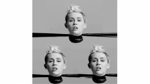 And by "insane," I mean it's absolutely horrifying and will probably show up in my nightmares. This video — titled "Tongue Tied" — is Miley's collaboration with filmmaker Quentin Jones, and it's like nothing Miley has done before. It's like if David Lynch decided to make a music video for Miley Cyrus. The black and white video features a whole bunch of unsettling images, and it's a far cry from Miley's cheerier (if also weird) video for "We Can't Stop." Images include Miley as a disembodied head, Miley smearing black paint all over her body, Miley with duct tape X's over her breasts, Miley throwing her tongue left and right — err, well, the last part doesn't seem quite so weird, but you get it.