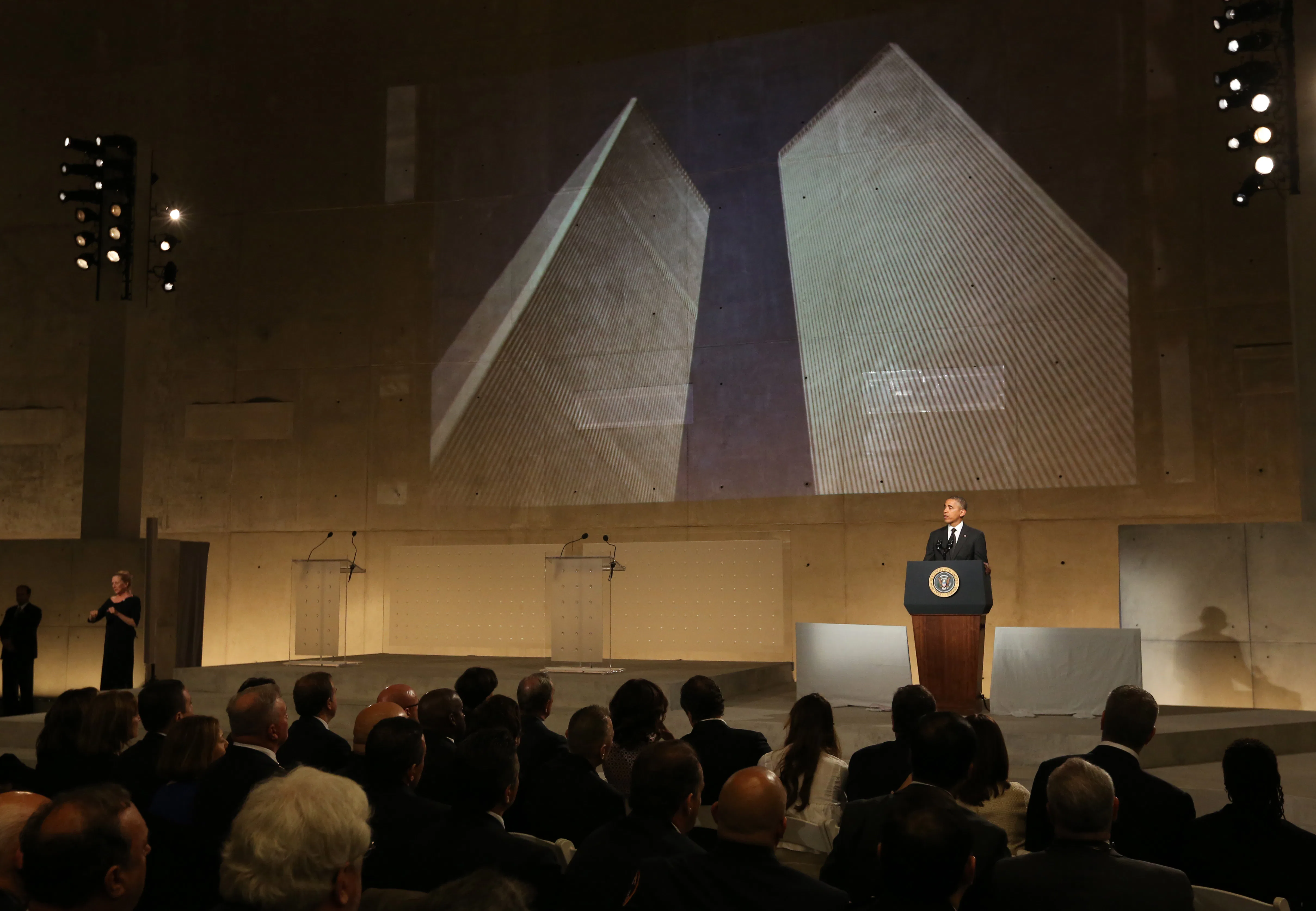 The president remarked how moving the museum is, but his words were just as emotional. "I think all who come here will find it to be a profound, moving experience," Obama said. "Here at this memorial, this museum, we come together, we stand in the footprints of two mighty towers, graced by the rush of eternal waters."