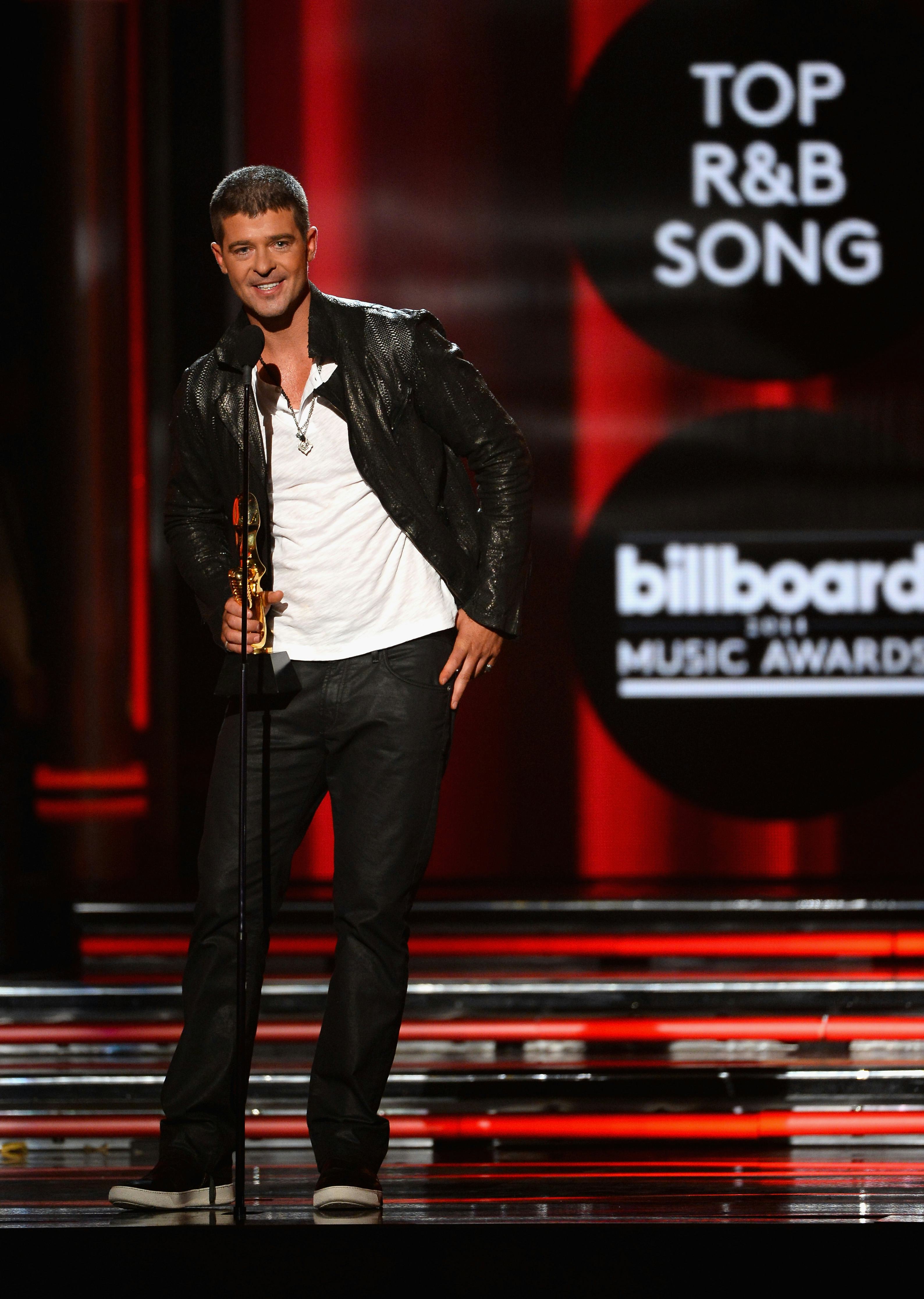 Back in February, Robin Thicke and Paula Patton announced their separation after nine years of marriage and many, many years together. (The pair met when they were just 14 years old.) And, in the months since, Thicke has made his intention to get back together with Patton very clear, releasing a song called "Get Her Back," which he reportedly wanted to sing at the 2014 Billboard Music Awards in an attempt to win Patton back. But it seems like his desperation has sunk even deeper — the pop star took to the stage at the awards show and delivering a speech for Best R&B Song dedicated to Patton. "I'd like to thank my wife for her love and support and for putting up with me all these years," Thicke said. So, take that, separation?