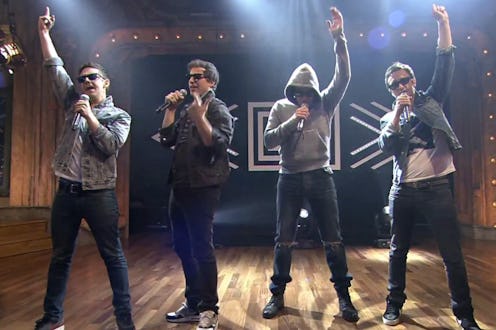 The SNL-sketch-turned-band called The Lonely Island performed "YOLO" on Fallon last night, and it was fantastic. Joining Andy Samberg, Jorma Taccone (a.k.a. Booth Jonathan from Girls) and Akiva Schaffer in their rap about how important it is to take precautions while you're young (because you "only live once", after all) was none other than the host and first-time father Jimmy Fallon, along with in-house band, The Roots.