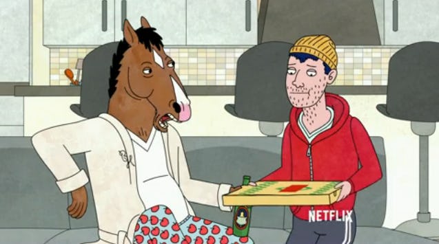 On the show, BoJack Horseman is a former sitcom star who starred on a show called Horsin' Around in the 90s and who now spends his time hanging out with his human friend Todd (Paul) and his ex-girlfriend/agent Princess Caroline (Sedaris). Oh yeah, all the animals still have animal-like names. The show also features dog-man named Mr. Peanutbutter who dates a human.