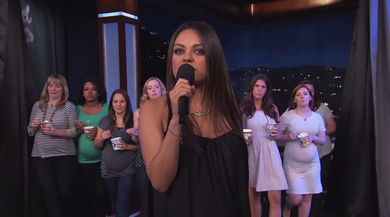 Kunis is currently pregnant with Ashton Kutcher's baby and she was looking more gorgeous than any of us will ever be as she talked babies with Jimmy Kimmel. Then, Kimmel makes the mistake of saying that he and his wife are having a baby — of using that trigger phrase "we are pregnant" — and Kunis snaps. In a scripted way, of course. She takes the small mike off her clothes, picks up a handheld microphone, and takes the spotlight to the other side of the set, where she issues a public service announcement to all fathers-to-be.