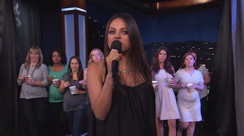 Ah, pregnancy. The miracle of life is about one part joyous and about several parts horrific. It's essentially nine months of swelling, nausea, and pain culminating in an attempt to push a person out of a place that doesn't seem large enough to accommodate them. The fact that we've had a rash of rumored (and some confirmed) celebrity pregnancies, such as Kourtney Kardashian's third child with Scott Disick and Rachel Bilson's first child with Hayden Christensen kind of makes it seem a little more glamourous than it actually is, but that doesn't change how annoying pregnancy can be. Like, having to roll out of bed to throw up in the wee hours of the morning. Or like when a man announces "we are pregnant" when telling everyone about his incoming child. It's that last minor annoyance that led to Mila Kunis issuing a warning fathers-to-be on Jimmy Kimmel Live! and it was hilariously epic.