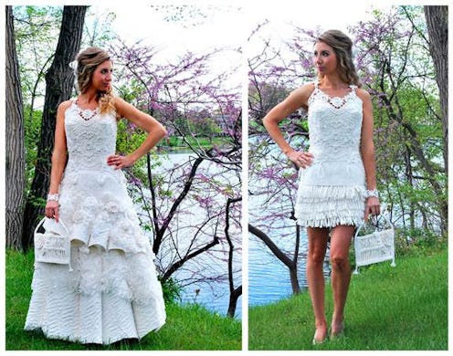 Thanks to Pinterest, the world of weddings has gotten much more DIY. Also much more mason jar-heavy. Is a wedding even a wedding anymore without some sort of home-decorated mason jar hanging around? And those chalkboard signs, man. Everywhere. But I digress. Recently, some brides have taken DIY weddings to a whole other level, creating wedding dresses at home instead of stopping at Kleinfelds's. When Cheap-Chic-Weddings challenged readers to create a dress out of toilet paper (yes, toilet paper), these girls really went all out. And I mean all out.