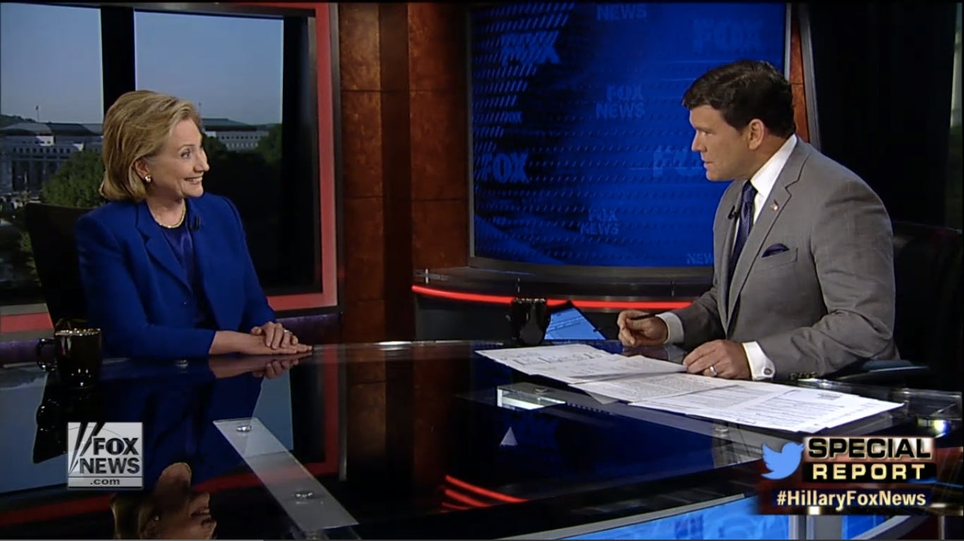 Fox News has been poised to take on the former Secretary of State for a while now, ever since her last interview back in January 2013. On Tuesday, Fox News' Greta Van Susteren and Bret Baier veritably grilled Clinton on everything from Benghazi to sexism to the NSA to the IRS — with the focus being mainly on Benghazi, because, well, it's Fox and they're thinking the timing of the Benghazi suspect’s capture is way, way too convenient for Clinton. Ahem.