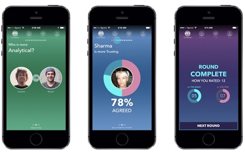 Questions cover a range of traits from spontaneity, to friendliness, to how sympathetic you are. Examples include: “Who is more likely to leave work early for a date?” “ and “Who is more likely to buy cookies from a girl scout?” Fortunately, the app departs from the Tinder approach by avoiding questions about appearance.