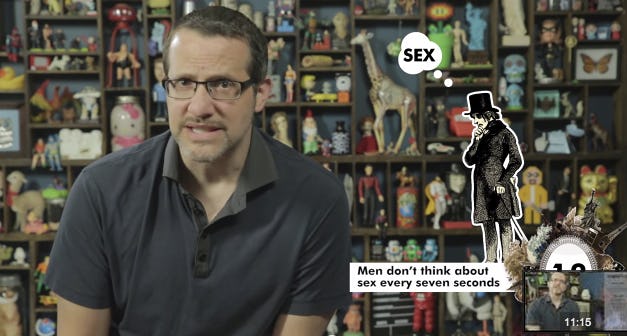 Are bigger breasts more sensitive than smaller ones? Do men think about sex every seven seconds, really? Can a guy die with an erection? In Mental Floss's latest debunking video, Dr. Aaron Carroll answers these questions and more, debunking 20 common myths about sex. I warn you, it may feel weird accepting sex facts from a man whose "salon" décor includes a toy giraffe, Pez dispensers, and a Hello Kitty in a jar. To spare you from the eerie experience of being educated about sex while staring at your favorite childhood toys, I’ve selected three of the video's most interesting myths for you.
