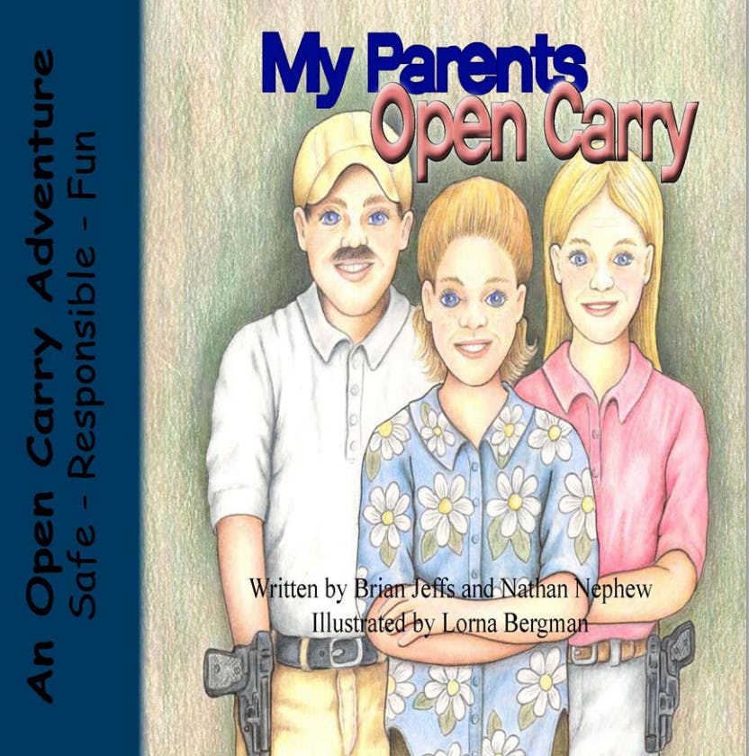So far, there's only one offering in this niche market, My Parents Open Carry by Brian Jeffs and Nathan Nephew. The book, published by White Feather Press and available for purchase in print or as a downloadable PDF, was written by Jeffs and Nephew after they "looked for pro-gun children's books and couldn't find any." Neither author is a professional writer (according to their bios, Jeffs is a senior geologist for the state of Michigan and Nephew is a software developer), but they are co-founders of the pro-gun lobby group Michigan Open Carry, so I guess that qualifies them to write a book with the express purpose of: