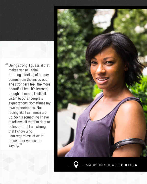 Everyone has something that makes them feel beautiful. [We] wanted to capture different visions of beauty, and document participants’ own impressions of what makes them feel beautiful… Interestingly, we found that people identified things like family, exercise, the outdoors, and even white teeth as being essential to their feelings of being beautiful.