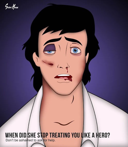 Middle Eastern artist Saint Hoax has been making waves in recent months with his series of campaigns that repurpose Disney characters to raise awareness of sexual abuse and domestic violence. After tackling the issues in “Pr incest Diaries” and “Happy Never After,” he’s at again — and this time, he’s broadening the scope of his projects. “Prince Charmless” targets men who have experienced domestic abuse, tearing down stigma and again urging victims to speak up.