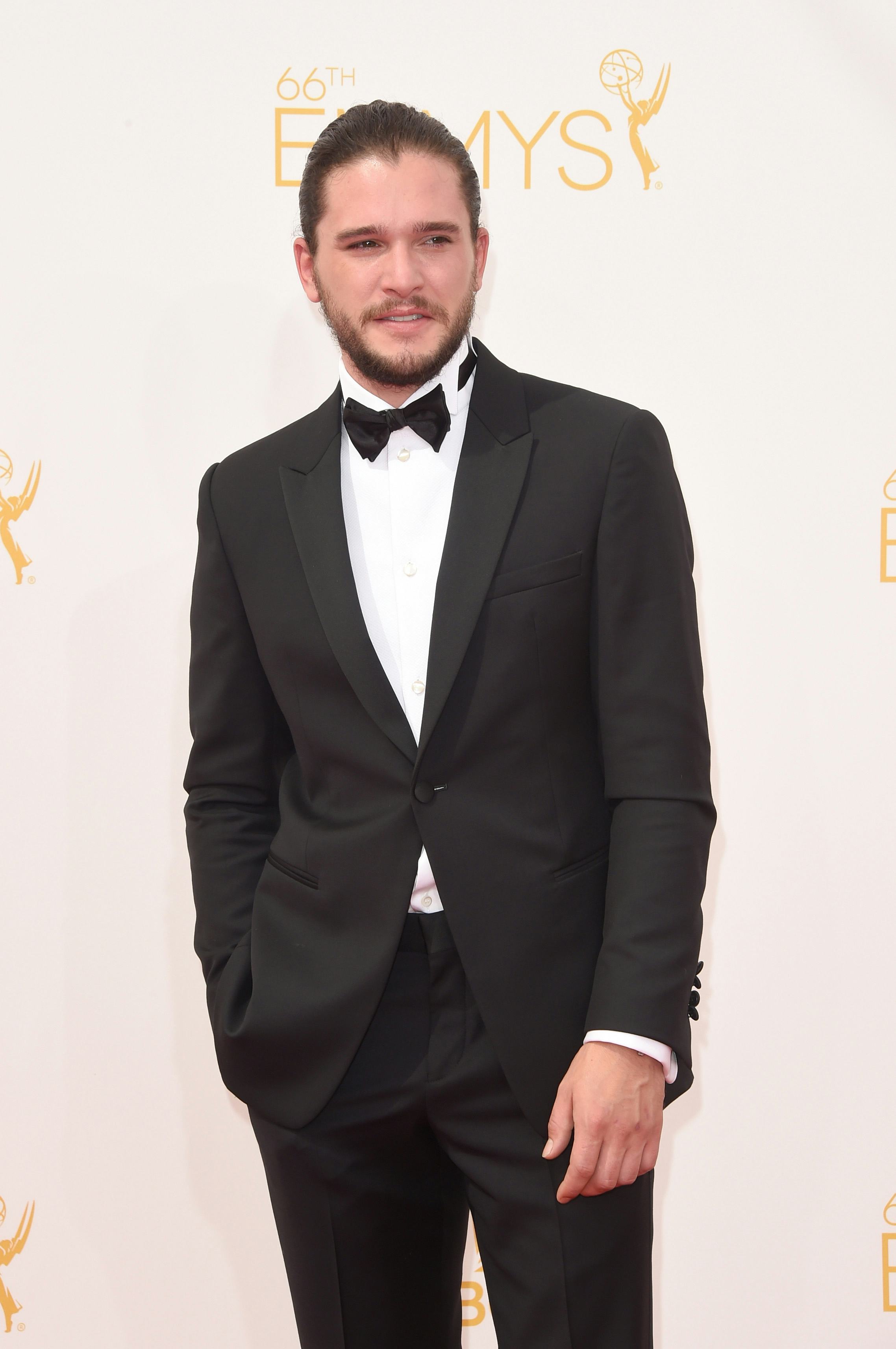 Oh, Kit. Oh, man buns (not the kind you're thinking of, unfortch). Kit Harington may complain about the long hair he's forced to sport in order to play the ever-brooding (and ever fur-cloaked) Jon Snow on Game of Thrones, but it looks like he's learning how to get creative. Creative in the sense that he's currently walking the red carpet of the Emmy Awards sporting a freakin' man bun.