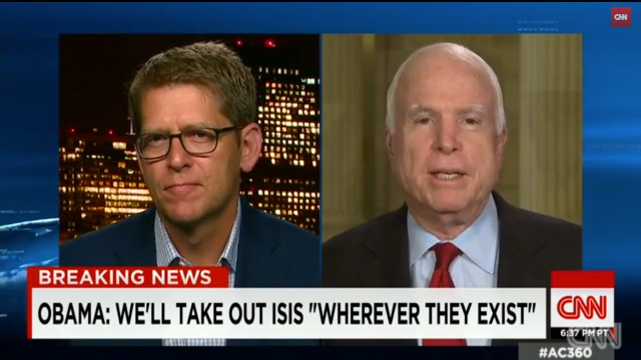 Just after President Barack Obama laid out his plans for dealing with ISIS crisis Wednesday night, McCain (R-Arizona) went on CNN to tell everyone just how much of the current Middle East disaster is the president's fault — and how wrong about everything Carney was, too.