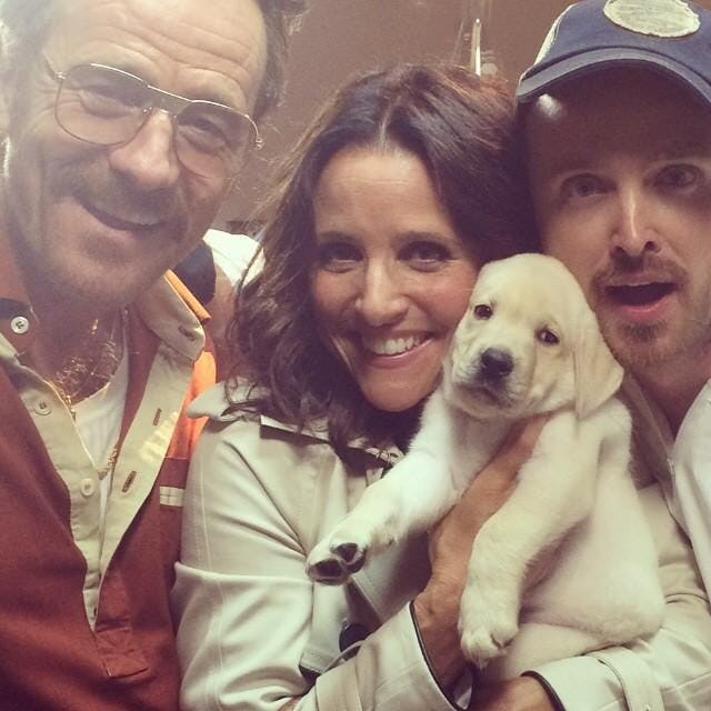 One of the best parts of the recent Emmy Awards that took place in LA last month was undoubtedly the lead-up to it: As part of the promo trail before the Emmy Awards, Julia Louis-Dreyfus, Bryan Cranston, and Aaron Paul all appeared together in Barely Legal Pawn , a sketch that parodied both pawn shop shows and Breaking Bad. It was amazing, needless to say — all three of those actors are great on their own, so of course, put them together and it's amazing times three — and the best part undoubtedly came at the end, when circumstances that I won't spoil (watch it instead!) led to the appearance of puppies. It was a bit of a tense moment in the sketch, but off-set, it looks like the trio made the most of their puppy time: In a throwback post on Twitter, Julia Louis-Dreyfus posted a picture of Bryan Cranston, Aaron Paul, and her all cuddling a puppy on the day of the shoot.
