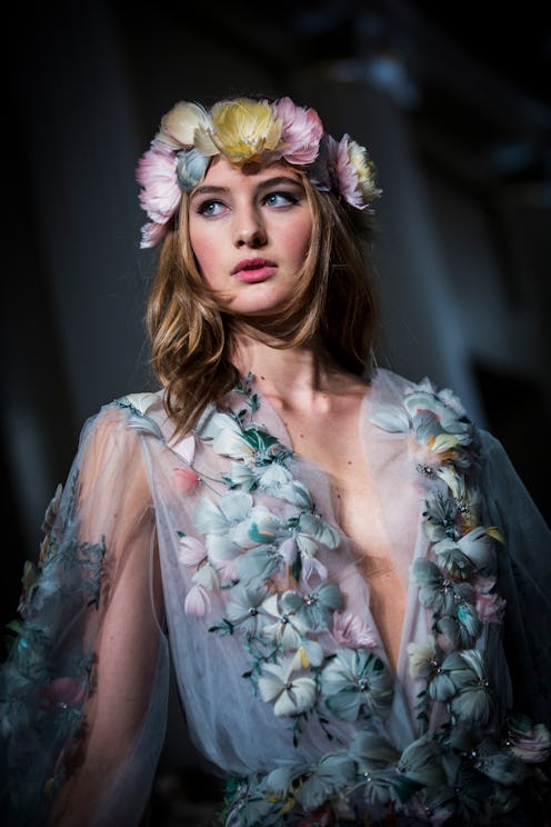 The Marchesa show, which marked a London homecoming for New York based designers Georgina Chapman and Keren Craig, featured billowing sleeves, lace details, romantic ruffles, and lots of flowers. Emphasis on lots. According to The Telegraph, Chapman wanted the collection to be, "a little bit gypsy, a little bit bohemian, with a bit of an edge to it." The inclusion of the natural, such as flowers and feathers, heightened the woodland romanticism of the collection, which was supposed to inspire the feeling of Kate Moss at Glastonbury. Dig out those wellies! To top it off, the free-flowing, soft wavy hair evoked that classic effortlessness that only takes us mere mortals several hours in front of the mirror to replicate.
