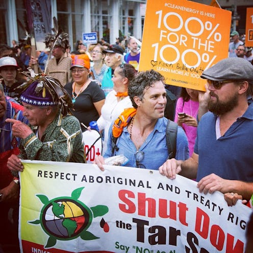 Mark Ruffalo is really taking this whole being a superhero thing to heart. The Incredible Hulk himself has set out to try and do good once more, except this time, he isn't so green and cumbersome (we hope). Gawker reports that he's got some friendly famous faces to help him in his quest for change Leonardo DiCaprio, Edward Norton (coincidentally also the Incredible Hulk), Sting, and Evangeline Lilly all took part in New York City's People's Climate March. They weren't just bystanders, though. The actors were quite literally right in the middle of all the action, holding signs and talking about why it mattered to them.