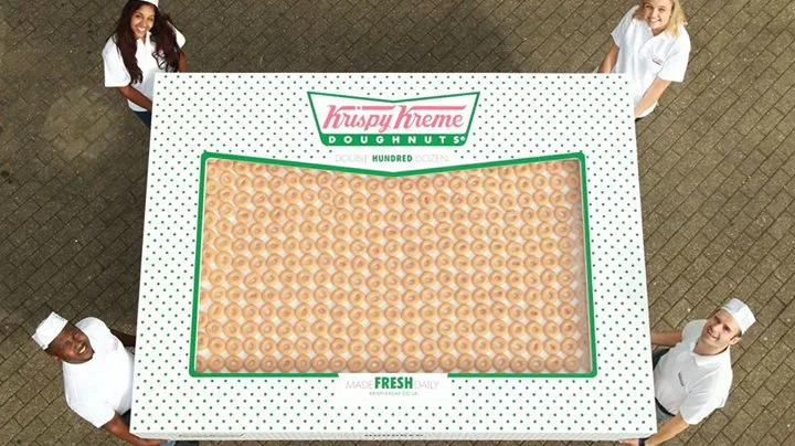 I often wax poetic about donuts; they’re one of my favorite baked goods, and there have been enough delicious variations on the theme recently to warrant a certain amount of florid prose (except for that whacko Buffalo chicken donut, because ew). If you’re getting sick of it, though, brace yourselves — more is coming, because Krispy Kreme UK just unveiled a box that holds a whopping 2,400 donuts. They’re calling it the Double Hundred Dozen, and it is truly a thing of magnificence. Be still, my fried dough-loving heart!