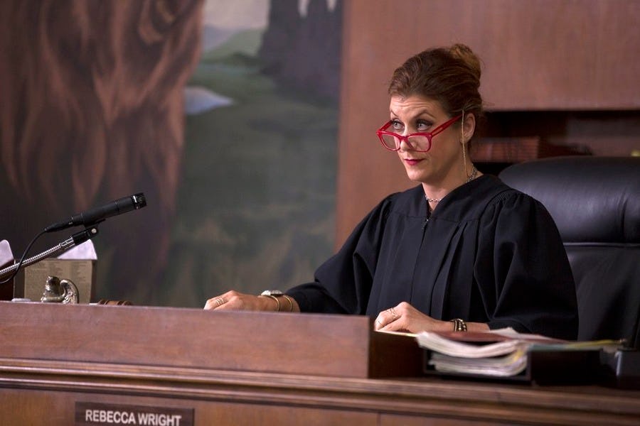 The episode opens in the midst of a vicious hangover for her character, Judge Rebecca Wright, as she scrambles to get herself in order before the dawn of a workday presiding over court. By the show's 10-minute mark, we've seen Walsh stumble through an unkempt apartment, celebrate the results of a negative pregnancy test, and pursue an ad hoc booty call with psychiatrist Gary Boyd (Ryan Hansen), a regular expert witness in her courtroom.