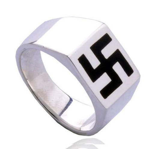 The silver ring emblazoned with a black swastika symbol was listed under men's "punk rock style" jewelry. Because antisemitism is so hardcore. But the product description was two steps ahead, seeking to dispell any hateful connotations.