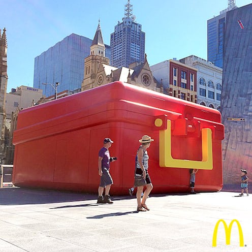 Once again, good old Mickey D's is taking fast food to a whole new level with the debut of McDonald's Australia's "World's Largest Lunch Box," a pop-up restaurant that's now circulating the country. The lunch box was created in the familiar shape of a Happy Meal, and McDonald's will be giving out free Steak Taster Wraps (a new item featuring steak and garlic aïoli, or steak and BBQ) to its Australian customers in cities like Melbourne, Gold Coast, and Sydney. All this comes after a report that the fast food chain's overall profits dropped 30 percent at the end of their last quarter, with Business Insider also reporting a 3.3 percent drop in sales worldwide. Seeing as Australia is one of McDonald's four troubled markets, this new pop-up innovation portends to boost sales across the country.