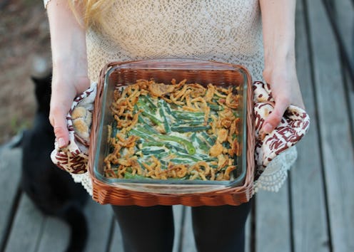 Instead of cream of mushroom like the traditional recipe calls for, melt some vegan spread in a skillet and sauté fresh chopped mushrooms, garlic, and onions in it — then add a little almond milk and cornstarch until it's the consistency of a thick soup. Combine your pre-steamed green beans, and bake in the oven until bubbly.