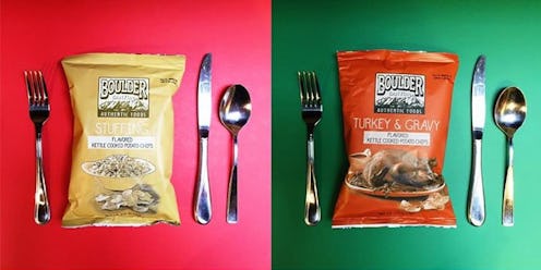 Violet Beauregard’s fate after popping Willy Wonka’s Three-Course Dinner Chewing Gum in her mouth is probably one of the most horrifying moments in children’s literature — but until she starts turning into a giant blueberry, the idea of something as small as a stick of gum tasting like a whole three-course meal is actually pretty appealing. I don’t know whether that was the inspiration for Boulder Canyon’s Thanksgiving Feast kettle chips, but it may as well have been: They’ve somehow managed to squash an entire Thanksgiving dinner into four kettle chip flavors. For real. Are you impressed? Because I am. I mean, I’m also a little grossed out… but mostly, I’m impressed.