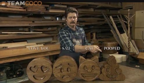 You have been hoping, wishing, and waiting for a way to revolutionize the way you communicate, and it is here. Last night, Conan on TBS premiered its parody infomercial for Nick Offerman’s wood emojis, which as you can probably imagine, are as hilariously rudimentary as they sound. "Hi, I’m Nick Offerman," the video opens, "You might know me from the hit show Parks and Recreation, and your spouse knows me from his or her sexual fantasies." (Fact.) "I think it’s time we got back to a more old-fashioned, more personal, more American mode of communication. And that’s why I’m proud to introduce my new line of hand-crafted, solid wood emojis." At this point we’re hooked, curious, and acutely aware of our own susceptibility to infomercials.