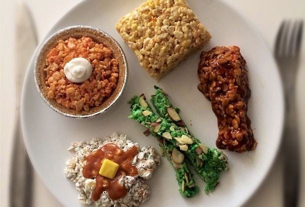Remember Floam? The slightly less popular cousin of Nickelodeon’s Gak? I imagine molding shapes out of Rice Krispie Treats is a lot like molding shapes out of Floam; maybe that’s just me, though. Check out more of Siskin’s remarkable creations — and get in touch with her about custom orders — on the @Mister_Krisp Instagram page.