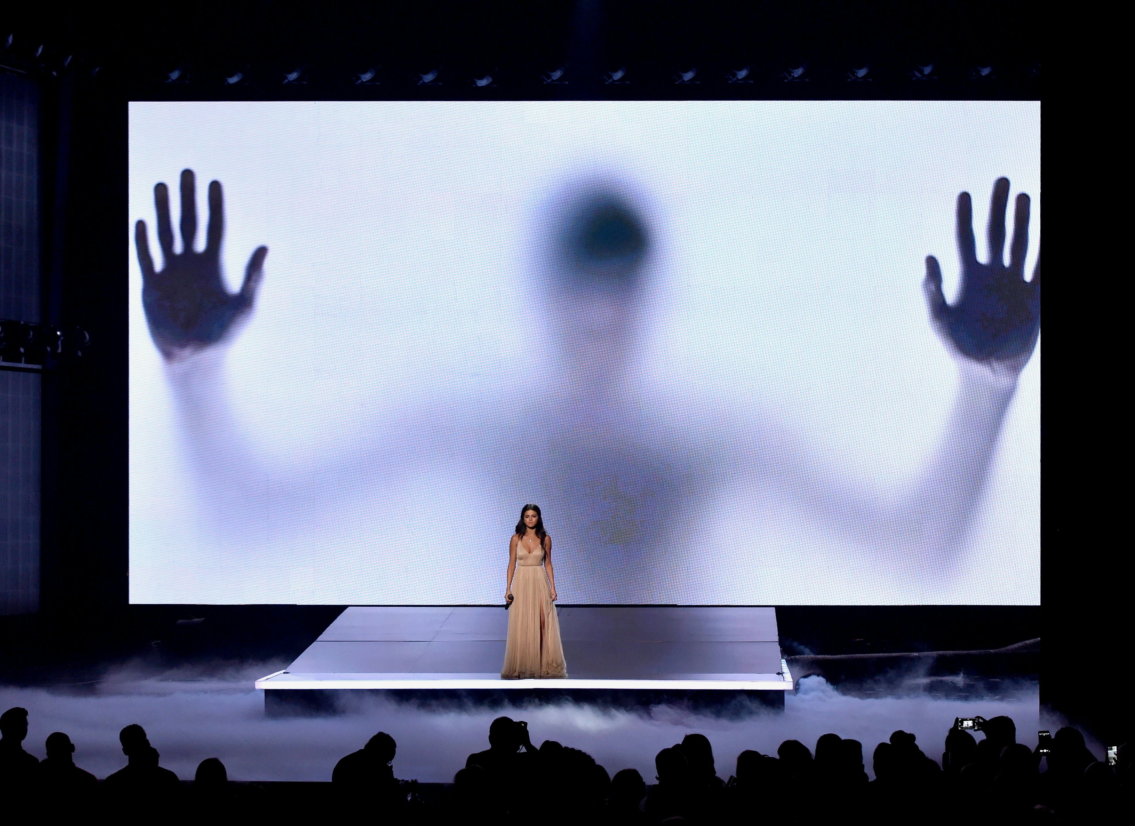Even during Selena Gomez's AMAs performance of "The Heart Wants What It Wants," she couldn't escape her ex-boyfriend, Justin Bieber. Considering the track is almost 100 percent about him, that's not all too surprising, but the real question is whether Bieber's silhouette was behind Gomez on stage, or if it was just a generic representation of her ex creepin' on her. There was already a conspiracy theory floating around that she mouthed "I love you, Justin" during the performance (though it looks more like "thank you, Jesus") but the idea that Bieber was haunting her during the song isn't as outlandish. Either way, it was an ominous looming of this guy, and likely was some sort of message to the Biebs.