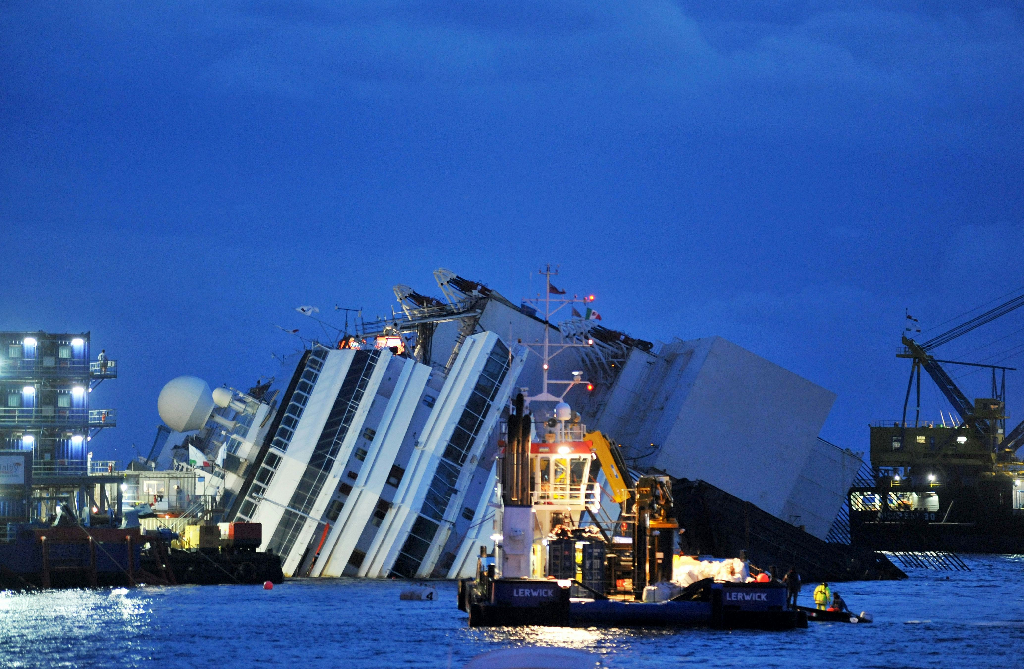 The Concordia, which was carrying 4,200 passengers, crashed into a reef on the coastline of Giglio, Tuscany, in Januray 2012, tearing a 230-foot hole into the ship, and leaving thirty-two people dead, as well as two people missing.
