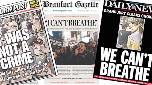 Wednesday's stunning grand jury acquittal of the officer who put Eric Garner in a chokehold — a mere nine days after the Ferguson grand jury's similar acquittal of Darren Wilson — ignited a spate of outraged protests across New York City, whose residents took to the streets to display their frustration and disgust. The following morning, the New York Daily News' front page cover, "WE CAN'T BREATHE" against a somber black backdrop and a picture of Garner with his hands up while being held by Officer Daniel Pantaleo in a chokehold, summed up the paper's fury at the decision.