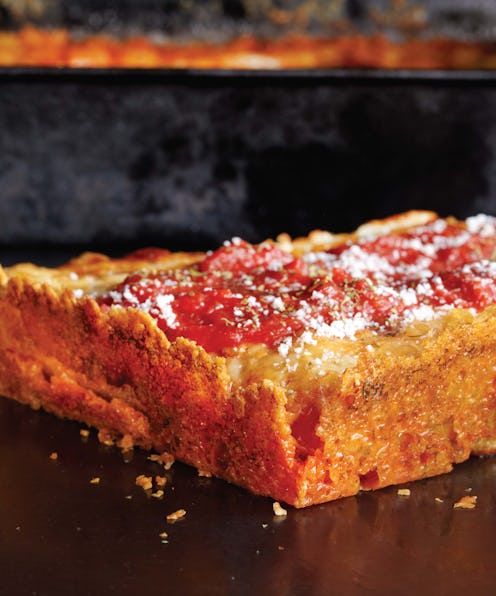 Detroit-style pizza was invented in the 1940s by Gus Guerra, the owner of Buddy’s Rendezvous. It’s rectangular, thick, and fluffy like a Sicilian pizza and is framed by a border of crispy golden brown cheese that tastes like the best part of a grilled cheese sandwich — the stuff that leaks out of the edge and gets toasted in the pan.