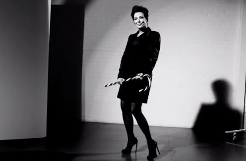 For the most part, Kris's short clip is less gleefully dirty than the videos starring younger women (particularly the one in which her own daughter is playfully spanked by Santa). She dances with an oversized candy cane and makes silly faces while the song "Let's Have a Kiki" plays in the background. But something about the whole thing is just, well, really awkward. Jenner seems uncomfortable. I do like her outfit, however, which is a black jacket layered over a black dress, tights, and spiky heels. Plus her amped-up short hair is fierce.