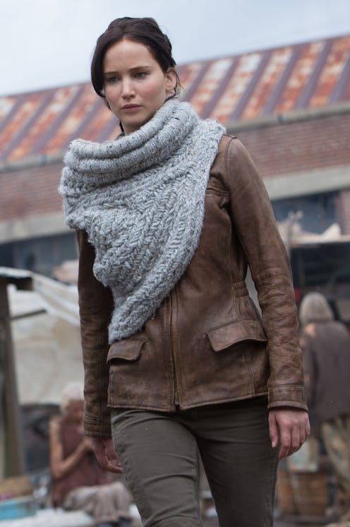 But even better than her facial expression is the outfit they chose to put her in. It's her hunting gear from Catching Fire. You know, her father's leather jacket, gray scarf, worn boots, and her homemade bow and arrows. I love that they didn't choose to put her in her tribute uniform or even one of Cinna's dresses. Those just represent her horrific days fighting for her life in the arena. It's what the Capitol wanted her to look like, not who Katniss actually is.