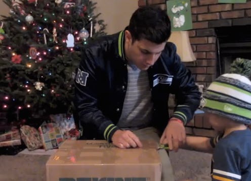 After snapping a picture together, Alex asked if he could maybe meet Turbin after the game the following day, which The Girlfriend (hmm, I'm having vague, feminist feelings about her not even getting a name in any account I've read of this story, but let's push past it) agreed to. But Hughes, being a dumbass (sorry but I mean, get it together, bro), let his phone die at the game and they never met up. He went home disappointed. That is, until a month later, when a big box printed with the Seahawks' logo showed up at his door. The rest plays out in pretty adorable fashion here: