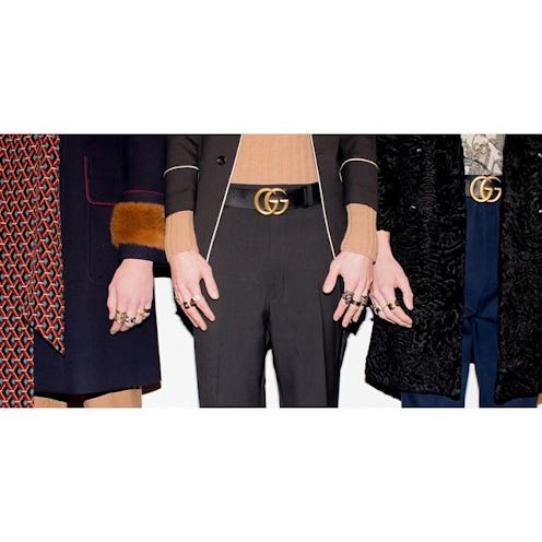 To further the flirtation with upended gender roles, Gucci tossed in several menswear-clad women to throw audience members for a loop. The label's menswear accessories were similarly demonstrative of feminine influence, from sweet, jewel-toned berets and glinting metal buckled belts to suede satchels.