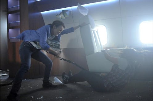 Fitz and Simmons irradiate the device, blasting a hole in the side of the Bus. This, along with running out of ginger ale or complimentary headphones, is one of the very worst things that can happen to a plane. The good guys successfully fight off the bad guys, some of whom get sucked out of cabin, as May reclaims control of the cockpit. Skye resourcefully seals the hole by inflating the on-board life raft.