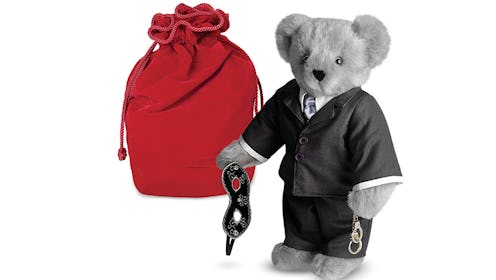 Like ... okay, it's just ... alright, the bear is carrying a tiny bear-sized mask, but then also comes with one human-sized mask? And then also he has these handcuffs? And the Vermont Teddy Bear website's ad copy says "Bear seduces her with silky, smoky Grey fur." Is she ... me? Am I ... her? I mean ... just ... am I supposed to bang this bear??