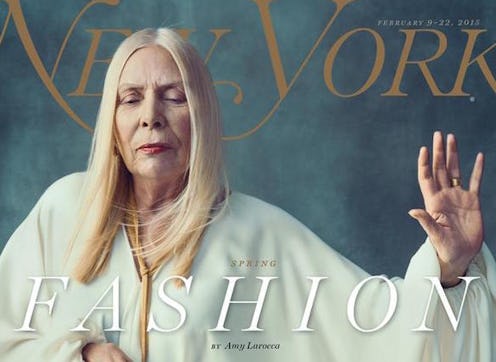 It's no secret to anyone who knows me that I can't wait to go grey, and my partner is of a similar mindset, regularly complaining about his beard not having enough silver in it for his liking. Going full silver fox is definitely not considered a bad thing by some people — grey hair can bring with it the implication of wisdom, dignity and demureness. I mean, in theory it should. Unfortunately, though, there exists too much erasure of people who have actually reached the age of naturally grey hair within our media — especially when it comes to women in fashion. Who's the first person you think of when you think of "aging gracefully" or when trying to remember someone who's a babe with grey hair? George Clooney? Richard Gere? Basically any dude over 50? Yeah, thought so.That's why when I saw Joni Mitchell's New York Magazine cover yesterday, I felt a little whoosh of pride and excitement. She looks amazing and ethereal in her white caftan — just another win in the string of triumphs for visibility of "women of a certain age" of late. Take, for example, the website/book/film Advanced Style ; Barneys and Bruce Weber's "Better Than Ever " campaign; Joan Didion's Celine campaign; the inimitable Tilda Swinton for NARS; and Mitchell's own campaign with Yves Saint Laurent — all venues and campaigns promoting and providing visibility to older women. Not just your average older woman, either, but the ones who refuse to shrink and who continue to make themselves intentionally visible. Bustle writer Arielle Dachille already broke down why the "golden girl" trend is so huge for fashion (and what is still problematic about ageism in our society), but here are five reasons why I'm personally in love with seeing these beauties in advertisements: