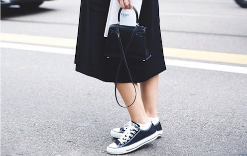 Your developing girl crush aside, you might not be able to make your lipstick stay after a few rounds with your morning coffee, or pull off a statement coat like it's no big deal, but you can find a way to incorporate sneaks into your look. It's not just for fashion people anymore. They've worked and played with the trend enough to see what works and what doesn't, and now they're passing down their key styling rules to those of us who are a little more shy with our mix and matching.