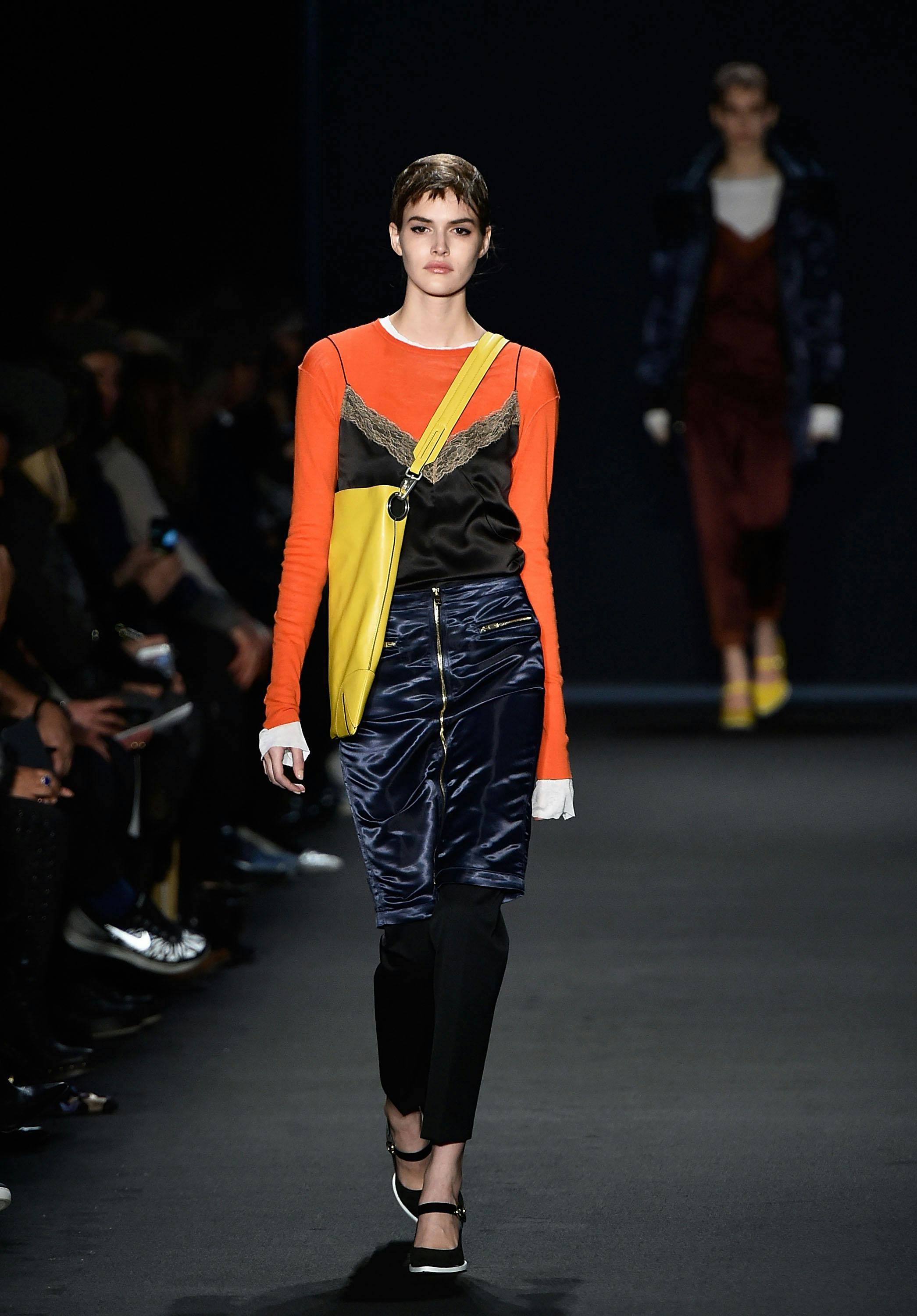 The Fall '15 show featured models donning silk, lace-trimmed camis on top of long-sleeved crewneck tees in an array of bright colors. If that doesn't scream 2002 I don't know what does. The masterminds at R&G didn't stop there, they threw in a whole slew of '00s inspired accessories such as fanny packs, zippers, satchels, and shiny fabric galore — oh my! So if you've stored away your old lace-trimmed satin tanks in hopes of one day breaking them out again, you're in luck.