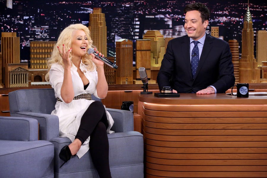 Jimmy Fallon has brought us many amazing moments on The Tonight Show , including lip sync battles, water-soaked sexy men, and a Saved by the Bell reunion, but one of his best yet may have just happened. During a game of Wheel of Musical Impressions, Christina Aguilera's Britney Spears impression was so spot-on that I thought that Brit-Brit was in the room. (And when Fallon asked if she knew Spears, Aguilera joked, "Little bit, little bit.") The Voice coach set "This Little Piggy" to "Baby One More Time" and if you close your eyes, you probably can't tell the difference. Before that, she mastered Cher singing the Folgers' jingle and Fallon did David Bowie's rendition of "Grand Old Flag, but none of the other tracks garnered as much laughter and applause as "Little Piggy."