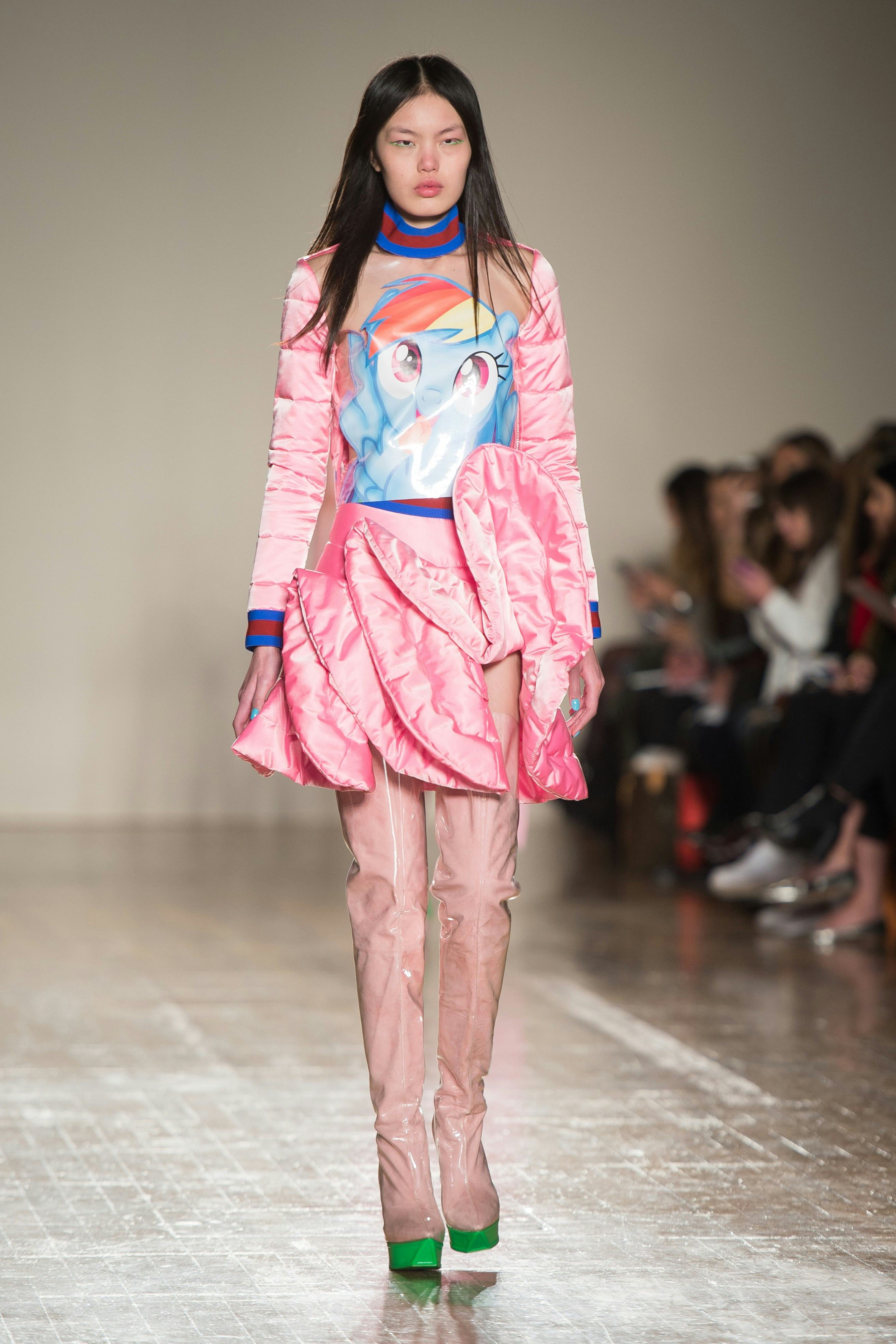 New York Fashion Week feels like a dreamy distant memory when compared to what we’re seeing play out in England. While New York remained predominantly (and elegantly) true-to-form, London seems to be channeling her inner 5-year-old in her mom’s closet — all at once playful, imaginative, and chic. Because why shouldn’t blue fur be a part of your wardrobe? Why not geometric shapes and pastel hues? Why not wear a designer interpretation of your favorite childhood horse, you know? (“We collaborated with My Little Pony and Michael Wolf who is an amazing photographer in Hong Kong,” Fyodor Golan told Wonderland of their buzz-worthy aesthetic.)