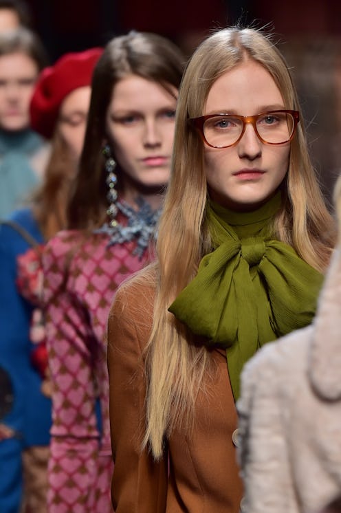 Alessandro Michele's debut women's collection for Gucci sent androgynous models with subdued florals, simple glasses, coats with fur accents, and stewardess-esque long bows around a subway-like setting at MFW. With minimally done makeup and effortless hair, the clothes and accessories spoke for themselves. The beret and beanie-topped models were gliding, not stomping, in slippers a la Birkenstock, low-slung black gladiator sandal heels topped with pom poms, braided and patented textures.