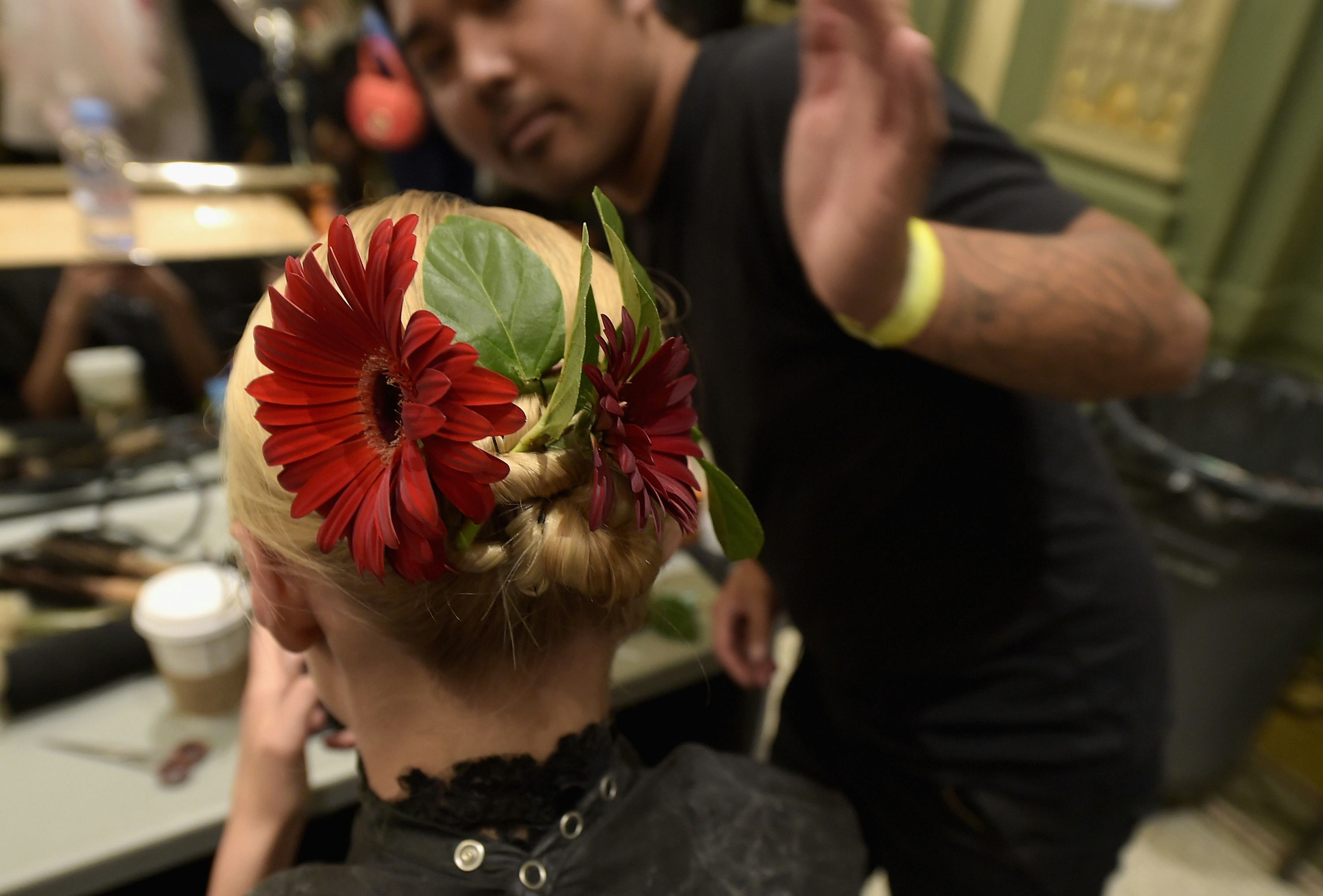 While the fresh red, leafy gerberas in the brand's presentation were delightful, bold, and all kinds of gorgeous, plucking fresh flowers from my nonexistent New York City garden every morning to twist in my tresses, doesn't exactly fit into my schedule. But these floral hair accessories below are just as pretty — and will last way longer than just a single jaunt down the runway.