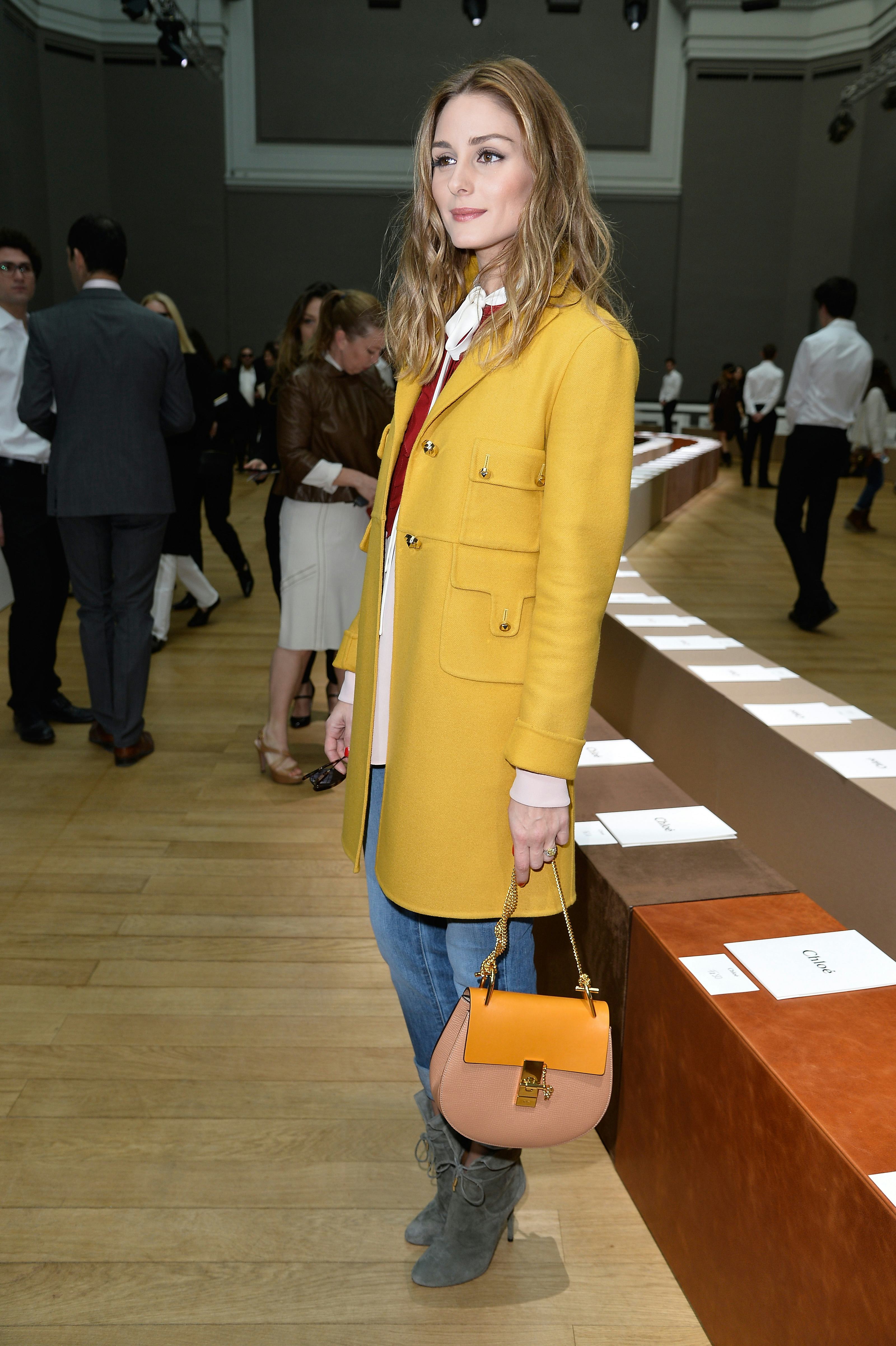 In today's not-so-surprising news, Olivia Palermo is looking fierce in the French city this week. But what else were you expecting from our favorite reality-star-turned-fashionista? First, the 29-year-old American socialite showed up at the Giambattista Valli show looking stunning with a full face of makeup and leather jacket. And then she decided to opt for a different look that I was equally obsessed with. My favorite look of Olivia Palermo's Paris Fashion Week outfits was one that consisted of a bright, cheery yellow coat that oozed mod chic vibes.