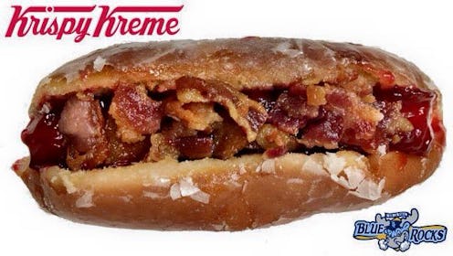 Y'know, I thought I'd gotten tired of weird food mashups; after all, there are really only so many jokes I can make about hybrid pastries or fast food partnerships. I have been proven wrong, though, by this donut hot dog thing from Krispy Kreme and the Wilmington Blue Rocks. The donut chain and Delaware-based minor league baseball team joined forces to dream the whole thing up. It consists of a hot dog lovely nestled within a bun fashioned from a glazed Krispy Kreme donut, topped with bacon and finished off with a drizzle of raspberry jam. And, well… even though I thought I'd written about my last bizarre food story for a while, I couldn't very well pass this one up, could I?