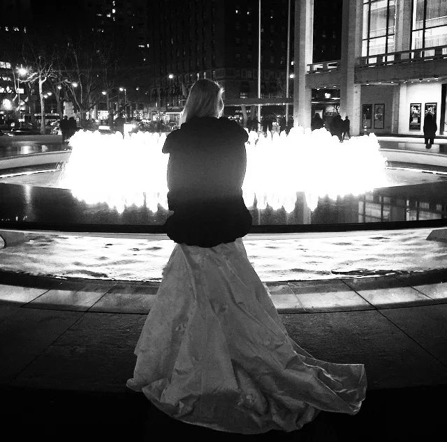 Well, Laine didn’t make it to the first act but during the first intermission we caught up and took some pictures on the patio. She was wearing a beautiful reception dress that she didn't get to use for her actual wedding. She also had on a fabulous, gifted pair of Valentino heels that she never wore. (Girl, those rosettes are meant to be seen.) I was glad this was an excuse to take these girls (the dresses, that is) out on the town: Why should we keep things hidden in our wardrobes, just because they're slightly impractical? People stared as we snapped selfies from the outside, and honestly, I felt like I was on display at a zoo whose spectators were New Yorkers trapped in the same semi-professional clothes on a Wednesday night. You would think in a city full of so much culture, they could be more blasé and respectful, maybe even admiring of clothes as cultural homage or something more personal.
