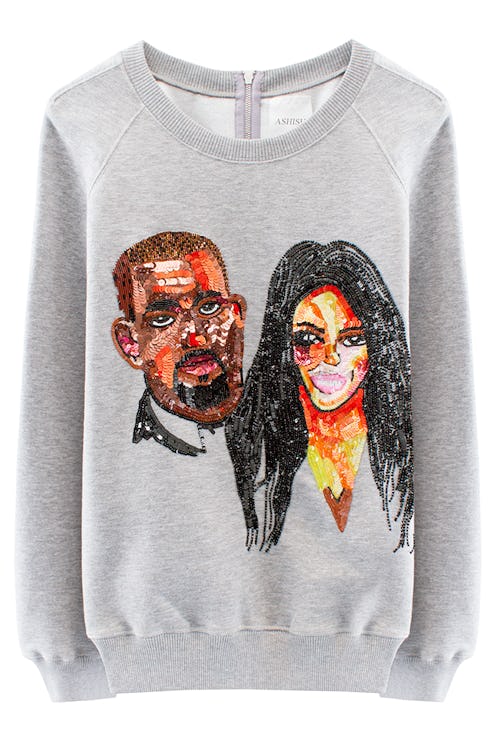 If find yourself watching a Keeping Up with the Kardashians marathon on E! for the third time this week or spending your days lounging in your head-to-toe One Direction band merch, it's time to add some sparkle to your celeb obsession. Ashish Gupta's sequined Kimye sweatshirt that debuted during London Fashion Week in September is finally available for purchase. Unfortunately, at $1,585 a pop, you might actually have to be a member of the Kardashian-Jenner family to afford one.